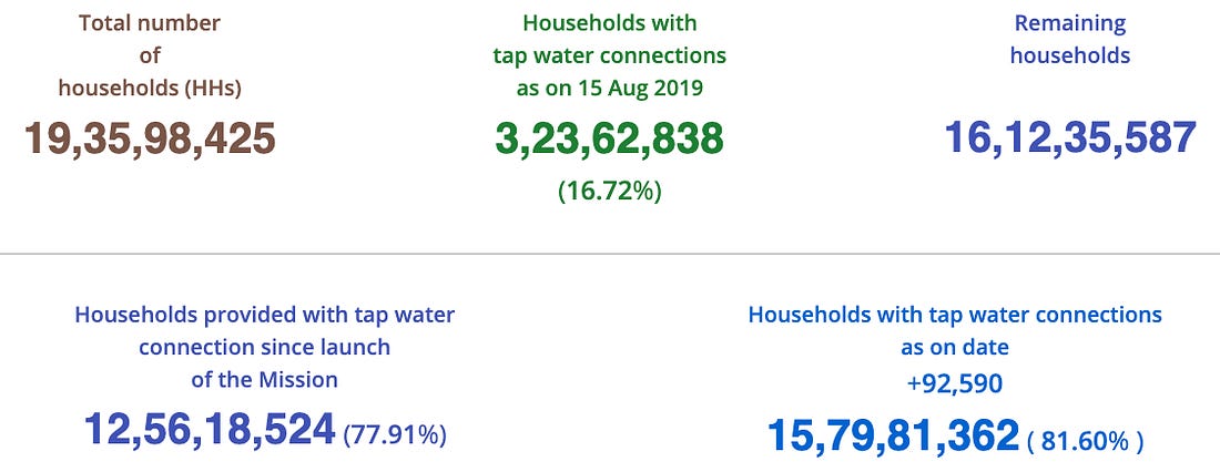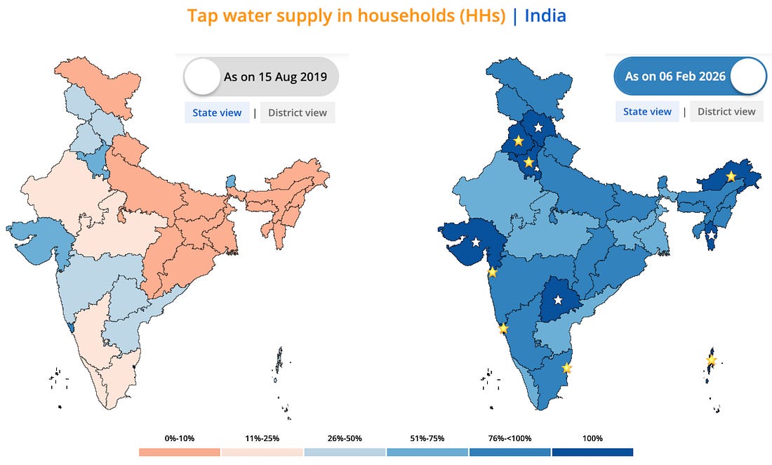 India has expanded rural tap water access from 16.7% of the population in 2019 to 81% in 2026 ((that’s seven years!)), connecting 125 million rural households to clean, running water. In sheer numbers, this is the biggest, fastest, and most important sanitation drive in human history. Why has it not been more widely reported? PIB Delhi